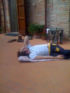 Il giorno prima era stato tutto magnifico..sveglia alle 10 per la vendemmia..rapida senza api e con una salopette di una bellezza incredibile..poi pranzo ricco..jacuzzi,ping pong,poi c’era Leo e Massi sono andati a dormire,gli altri 5 sono andati a comprare la carne e io sono rimasto 2 ore e trenta in Jacuzzi a meditare con di fronte il cielo azzurro e il paesaggio mozzafiato delle colline toscane…sono stato profondamente felice..e ho raggiunto un grado di rilassamento impensabile..